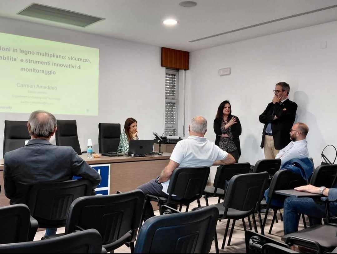 La Prof.ssa Ing. Carmen Amaddeo della Linnaeus University di Växjö (Svezia) ha tenuto una relazione di alto profilo scientifico sul tema del monitoraggio dinamico e ambientale delle strutture in legno multipiano, illustrando