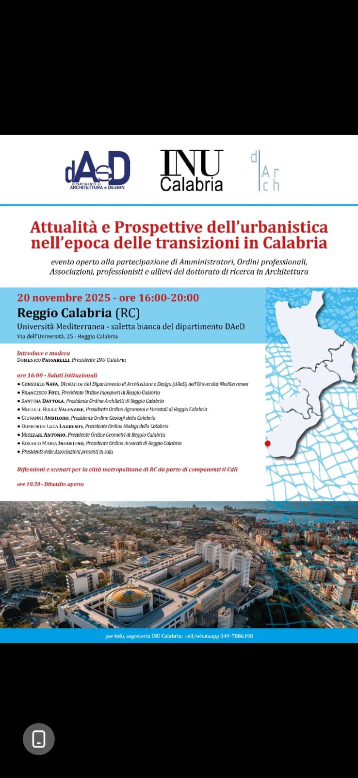 20_11_2025 Incontro: Attualità e prospettive dell'urbanistica nell'epoca delle transizioni in Calabria 10 novembre 2025 @ 09:23 notizie 20_11_2025 Incontro: Attualità e prospettive dell'urbanistica nell'epoca delle transizioni in Calabria