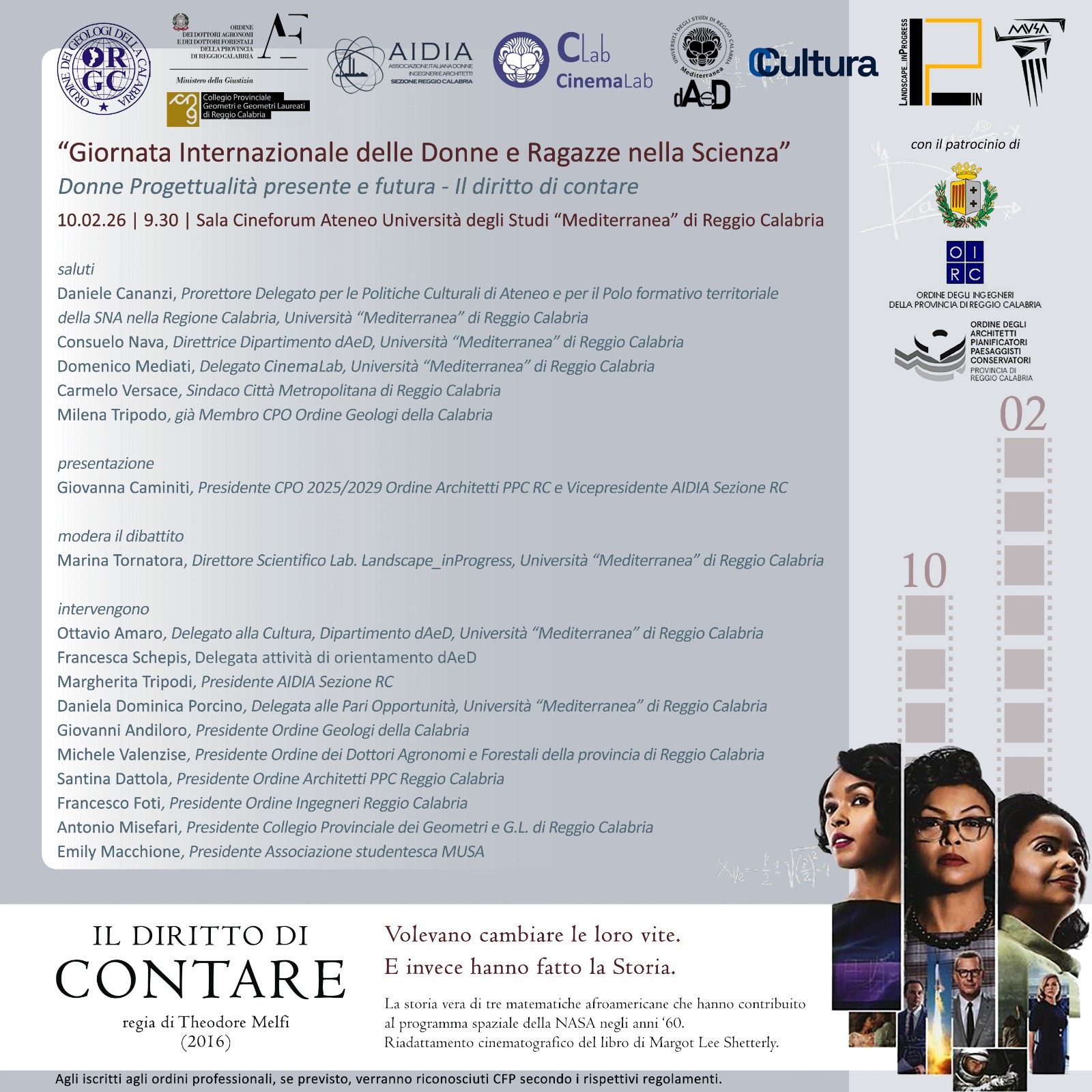 “Giornata Internazionale delle Donne e Ragazze nella Scienza” Donne Progettualità presente e futura - Il diritto di contare 10.02.26 | Sala Cineforum dell’Ateneo dell’Università degli Studi “Mediterranea” di Reggio Calabria (complesso torri Università) | ore 9.30