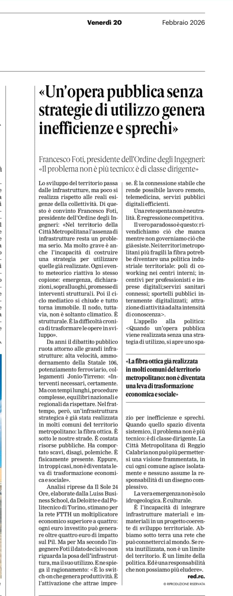Articolo UN'OPERA PUBBLICA SENZA STRATEGIE DI UTILIZZO GENERA INEFFICIENZE E SPRECHI
