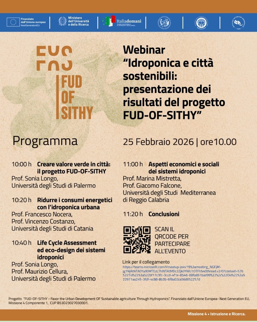 Webinar "Idroponica e città sostenibili: presentazione dei risultati del progetto FUD-OF-SITHY" 12 febbraio 2026 @ 17:41 comunicazioni Webinar "Idroponica e città sostenibili: presentazione dei risultati del progetto FUD-OF-SITHY"